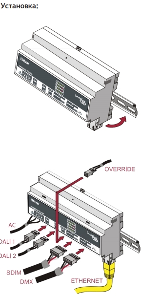 Монтаж: DIN-рейка. Держите сеть и DALI проводка отдельно от Ethernet кабель.
