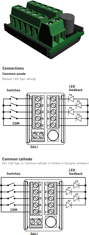 Блок ввода DIGIDIM представляет собой DALI-совместимый интерфейс разработан, чтобы позволить заказчику указанные переключатели, датчики, таймеры или другие устройства управления встроен в систему управления освещением DIGIDIM. Это имеет 8 входов без напряжения, которые могут быть либо мгновенными, либо блокировка, разрешающая выбор команд DALI.